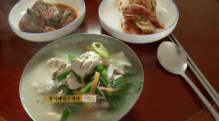 ‘방어밀수제비’는 방어 머리를 끊는 물에 넣고 메밀가루로 질게 반죽을 해서 숟가락으로 떠서 물에 넣습니다. 그리고 쪽파와 당근채, 고추를 넣고 끓여냅니다.
