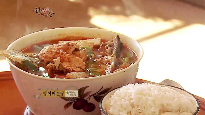 ‘방어매운탕’은 방어를 다듬어서 토막내서 넣고 무를 나박하게 넣고 김치 국물을 넣고 끓이다가 고춧가루, 파 등을 넣고 끓입니다.