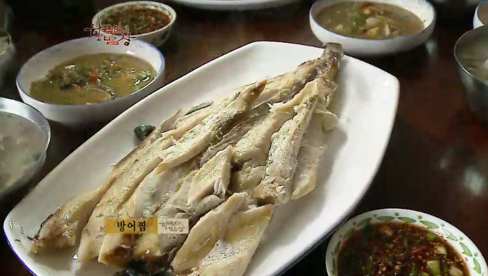 ‘방어찜’은 찜통에 방어 말린 것을 넣고 쪄냅니다. 그리고 간장양념에 찍어 먹습니다.