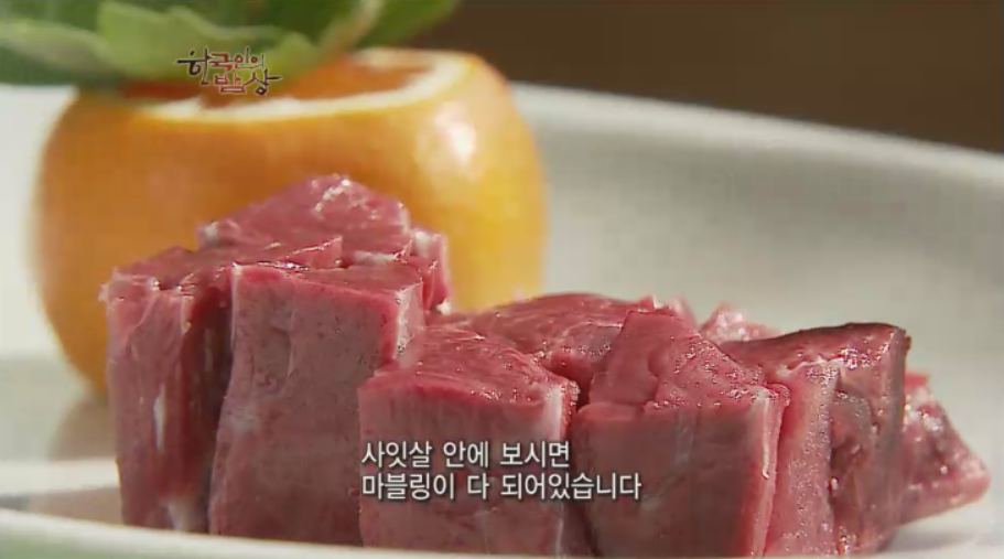 사잇살 안에 보면 마블링 다 있습니다. 그래서 사잇살을 주사위 모양으로 잘라 소금기름장에 찍어 먹으면 참기름이 퍽퍽한 육질을 부드럽게 해준다고 합니다.