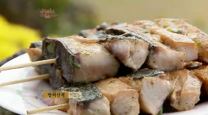 ‘방어산적’은 간장에 무를 갈아넣고 귤즙, 파, 후추 등을 넣여 양념을 만들어 길게 썰은 방어살에 뿌려서 재운 다음 꼬치에 꽂은 다음 팬에 기름을 두르고 구워냅니다.