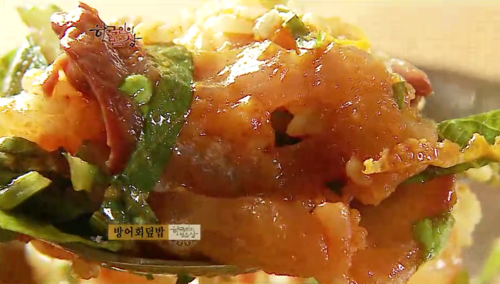 ‘방어회덮밥’은 방어살은 회를 치고, 여러가지 야채를 채썰고 그리고 밀감껍질(방어의 비린내를 잡아주고 상큼함.)도 채를 썰어 넣습니다. 그리고 초장에 비벼먹습니다.
