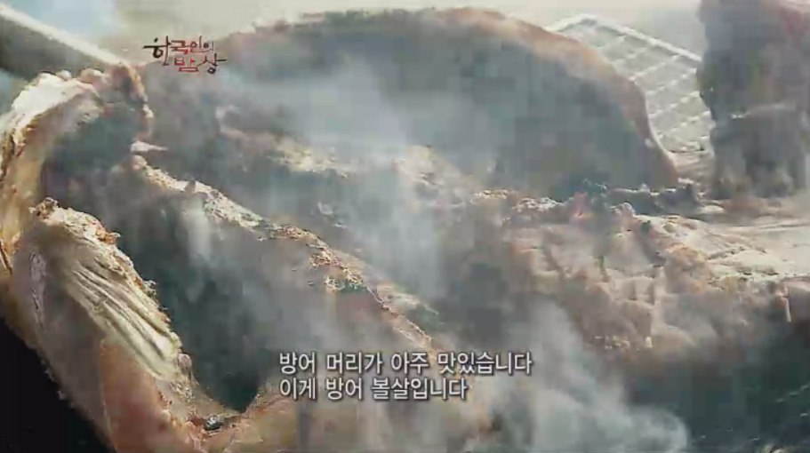 ‘방어머리구이’는 방어를 잡고 머리를 반으로 갈라서 석쇠에 올리고 굵은 소금을 뿌려서 굽습니다.