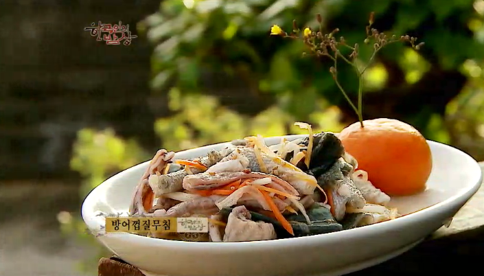 ‘방어껍질무침’은 방어 껍질을 한입크기로 잘라 양파, 당근채를 넣고 소금, 매실액기스를 넣고 무칩니다.