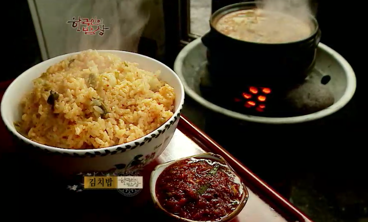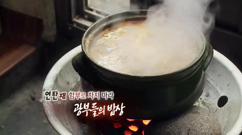 ‘김치밥’은 김치와 참기름을 넣고 쌀을 부은 뒤 물을 붓고 연탄불 위에 짓습니다. 그리고 담북장을 비벼 먹습니다.