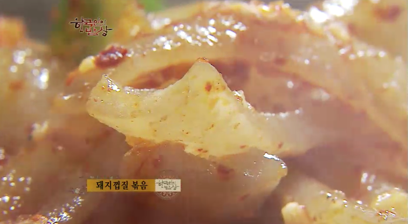 ‘돼지껍질볶음’은 돼지껍질을 삶아 먹기 좋게 썰고 양파, 당근, 대파에 고춧가루 새우젓, 다진마늘을 넣고 볶습니다.