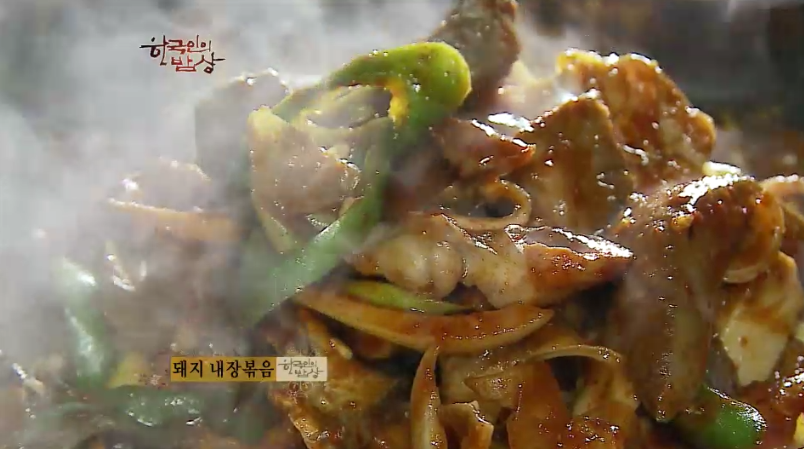 ‘돼지 내장볶음’은 돼지 내장들을 살짝 삶아서 먹기 좋게 자른 뒤에 고추장, 간장, 다진파, 다진마늘 등을 넣고 비비고 고추, 양파, 파 등을 넣고 볶습니다.