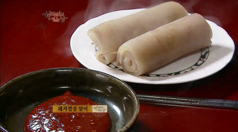 ‘돼지껍질 말이’는 돼지껍데기를 삶아서 돌돌 말아서 이쑤시개로 고정시키고 식힌 뒤에 먹기 좋게 썬 다음에 빨간장에 찍어 먹습니다.