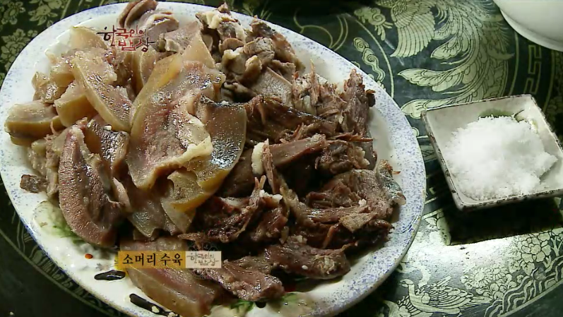 ‘소머리 수육’은 고기를 먹기 좋게 썰고 소금과 곁들입니다.
