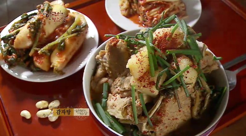 ‘감자탕’은 돼지뼈를 물속에 넣고 대파, 양파와 된장을 넣고 끓입니다. 그리고 감자, 시래기데친 것, 콩간것, 고춧가루, 양파, 대파, 된장 등을 섞습니다. 그리고 끓고 있는 돼지뼈에 넣고 푹 끓입니다.
