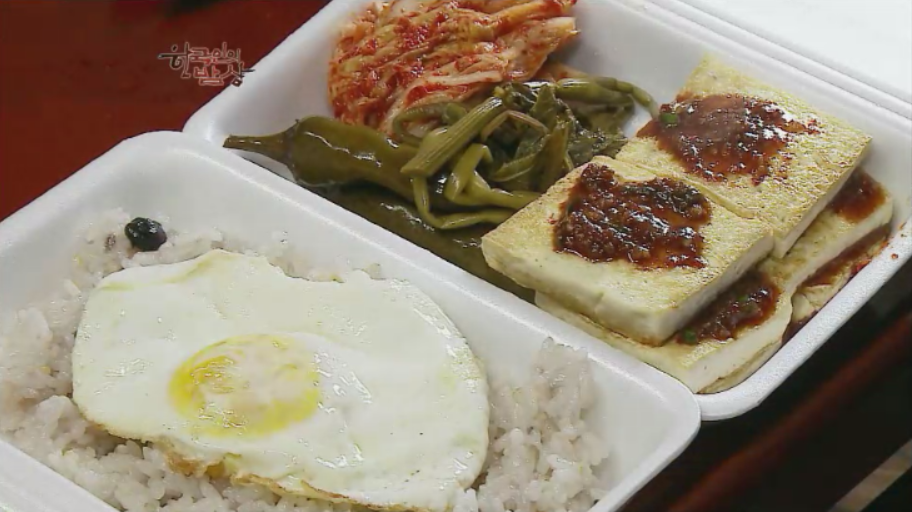‘광부도시락’은 일회용 도시락에 두부구이, 짱아찌, 김치 등을 넣어 싸줍니다. 탄가루가 묻어서 안지워져서라고 합니다.