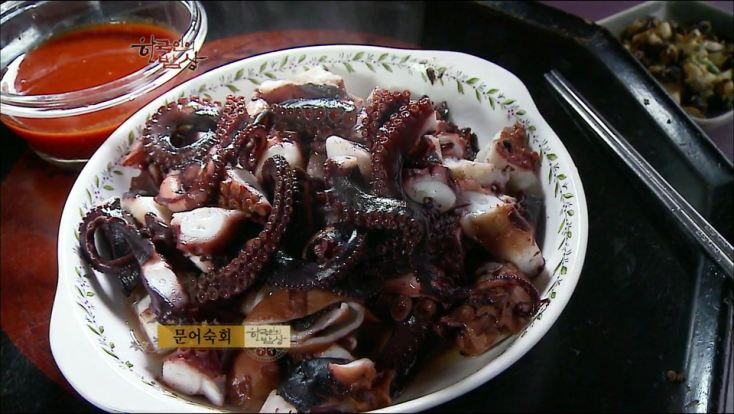 ‘문어숙회’는 무를 크게 썰어서 넣고 물에 손질한 문어를 넣고 무즙이 다 우러날 때 꺼냅니다. 그리고 먹기 좋게 썹니다.