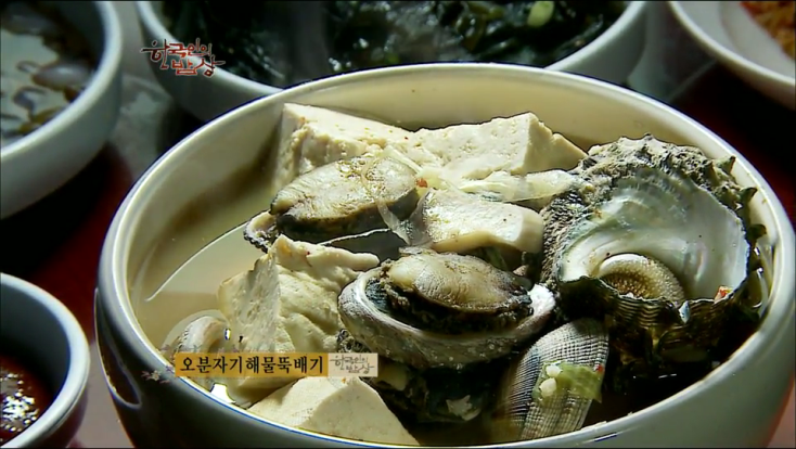 ‘오분자기 해물뚝배기’는 물에 된장과 고추장을 풀고 오분자기와 꽃게, 소라 등을 넣고 끊입니다. 그리고 두부와 파를 넣고 한소끔 끊입니다.