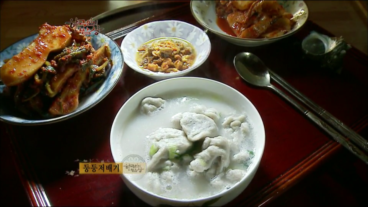‘둥둥저배기’는 메밀가루와 물을 섞어서 숟가락으로 치면서 걸쭉하게 반죽을 합니다. 끊는 멸치육수에 숟가락으로 한 수저씩 넣고 소금으로 간을 한 뒤 파를 썰어 넣어 익힙니다.
