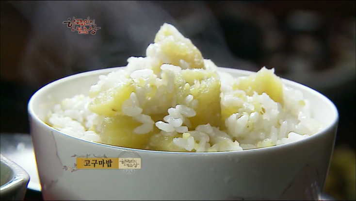 ‘고구마밥’은 고구마껍질을 벗기고 한 입 크기로 자른 뒤에 쌀과 함께 밥을 짓습니다.