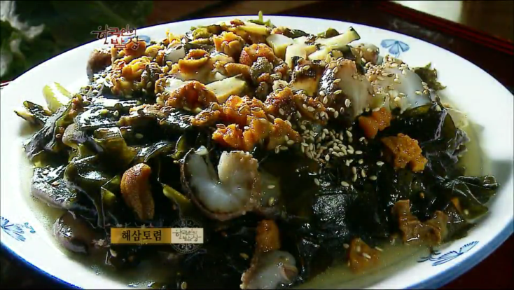 ‘해삼토렴’은 홍해삼을 배를 갈라 내장을 빼고 먹기 좋게 잘라 끊는 물에 데쳐서 찬물에 씻습니다. 그리고 소라도 삶아서 속을 빼서 먹기 좋게 썰고 미역도 썰고 말똥성게도 넣고 깨를 뿌려 비벼 줍니다.