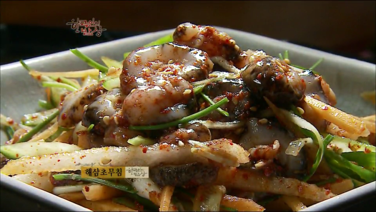 ‘해삼초무침’은 홍해삼을 손질해서 썰어 준 뒤에 오이, 당근, 배는 채썰고 달래를 송송 썰어 고춧가루, 깨, 다진마늘, 식초 등을 넣고 비빕니다.