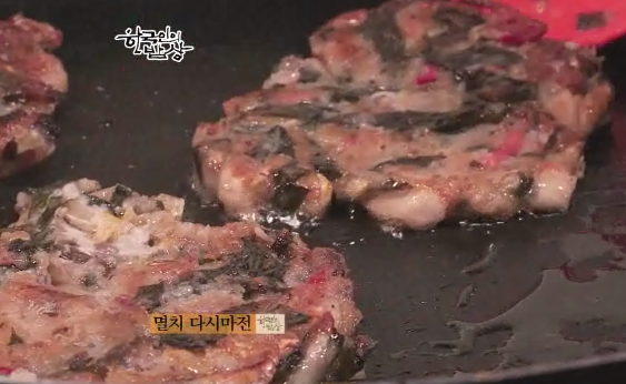‘멸치다시마전’은 다시마, 시큼하게 익은 배추김치, 고추 썰고 멸치를 곱게 다져서 밀가루 넣고 섞어서 기름에 지져줍니다.