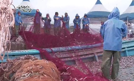 아주머니들이 모여서 멸치의 내장을 빼고 다듬습니다. 멸치를 다 다듬고는 막걸리에 헹구어내는데 그러면 살이 오돌오돌되고 식중독도 예방합니다.