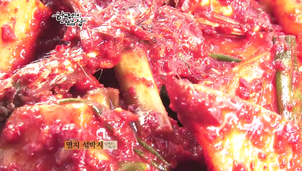 ‘멸치 섞박지’는 봄이면 이 마을에 빠지지 않은 밑반찬입니다. 생멸치를 사오면 씻어서 물기를 빼고 소금에 절입니다. 시원한 그늘에 보름을 둡니다. 멸치 살과 뼈가 그대로 분리될 만큼이면 적당히 절여진 겁니다. 계절따라 겨울에는 한 달정도 절여놔도 괜찮고 여름에는 일주일 있어도 됩니다. 생멸치만 하면 비려서 깍두기랑 무쳐먹습니다. 나박하게 썬 무를 소금에 절이고 멸치액젓에 고춧가루 풀고 마늘 다진 것 넣어 양념을 만들어서 무넣고 멸치 절인 것 넣고 쪽파랑 섞습니다. 멸치 한 마리를 무에 걸쳐 먹어야 제 맛입니다.