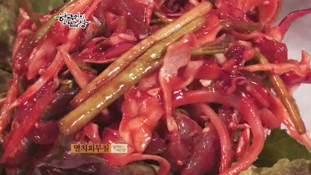 ‘멸치회무침’은 멸치회에 제철 아삭아삭한 채소와 과일을 곁들여 초장에 무쳐냅니다.