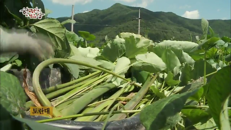 토란대는 채취 후 말리기 전에 밖에 하루 이틀 둔 뒤에 껍질을 벗기고 5일 정도 말립니다. 그리고 토란국에 넣고 개장국에도 넣고 소고기국에도 넣고 여러 가지로 씁니다.