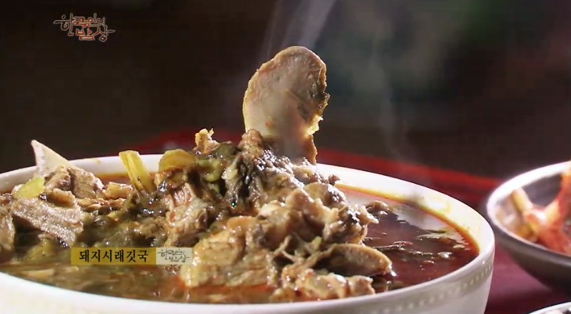‘돼지시래기국’은 솥에 끓는 물에 돼지뼈다귀를 넣고 삶고, 시래기도 따로 삶은 뒤에 돌로 찧어 펴주고 먹기 좋게 썹니다. 거기에 고춧가루, 다진 마늘 등을 넣고 양념을 해서 뼈다귀 삶은 물에 넣고 끓입니다.