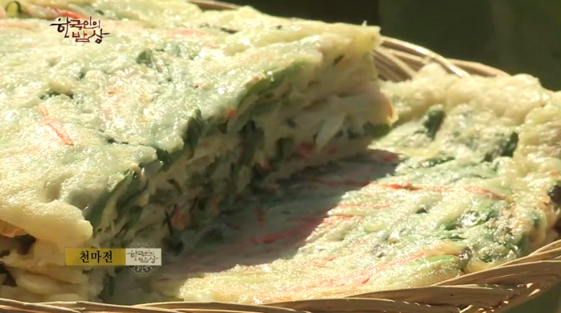 ‘천마전’은 천마를 강판에 갈아 다진 야채와 섞어 반죽을 만들고 쪽파를 반죽 물에 묻혀 깔고 부칩니다.