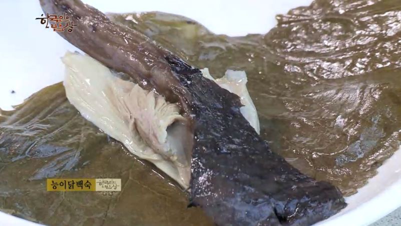 ‘능이닭백숙’은 능이버섯을 잘 씻어서 끓는 물에 넣고 데쳐서 건집니다. 그리고 그 물에 손질한 닭을 넣고 삶습니다. 그리고 곰취 장아찌에 닭백숙, 능이버섯을 싸서 먹습니다.
