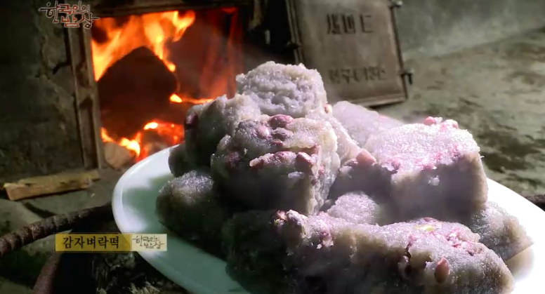 ‘감자벼락떡’은 감자를 숟가락으로 긁어 껍질을 까서 강판에 갈아서 면보에넣고 꽉 짜고 건더지만 찝니다. 그리고 짜서 나온 감자물에 밑에 깔린 감자전분과 섞어서 다시 강낭콩과 섞어 찐다음에 네모모양으로 면보를 접은 뒤에 돌을 마니 올려서 눌러놓습니다. 그리고 먹기 좋게 잘라냅니다.