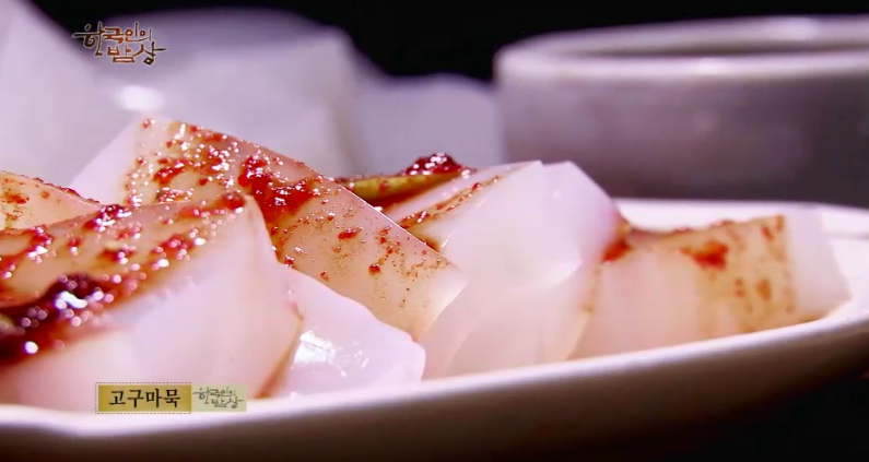 ‘고구마묵’은 고구마를 갈아 물을 내려 끓여서 그릇에 담아 굳힙니다. 그리고 썰어 간장양념을 올려 먹습니다.
