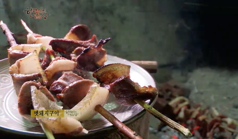 ‘멧돼지구이’는 땅속에 항아리를 묻어서 보관한 멧돼지고기를 꺼냅니다. 맷돼지를 먹기 좋게 얇게썰어 싸리나무를 다듬어서 끼웁니다. 그리고 숯불 위에 올려 굽습니다. 예전부터 멧돼지는 보양식으로 손꼽혔습니다.