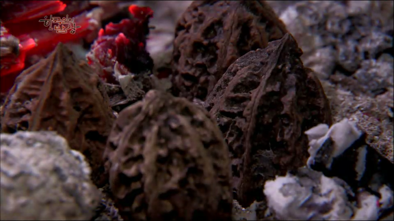 ‘가래열매구이’는 숯불을 골라서 껍질째 박아 구워서 까서 먹습니다.