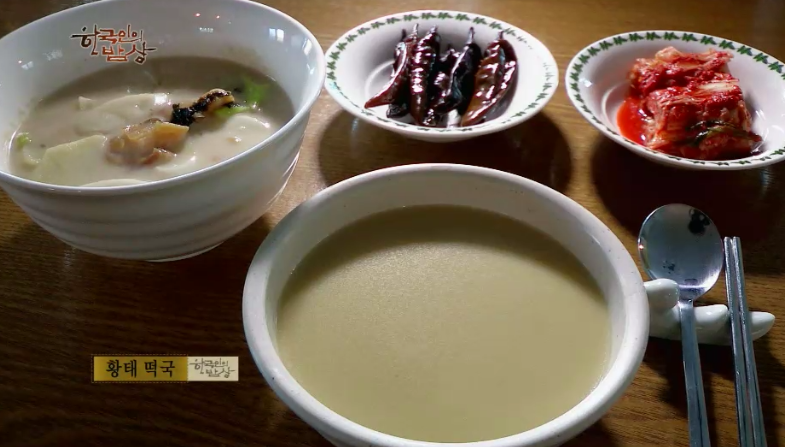 ‘황태 떡국’은 황태를 물에 넣고 푹 끓인 뒤에 걸러내고 떡과 파를 넣고 끓입니다.