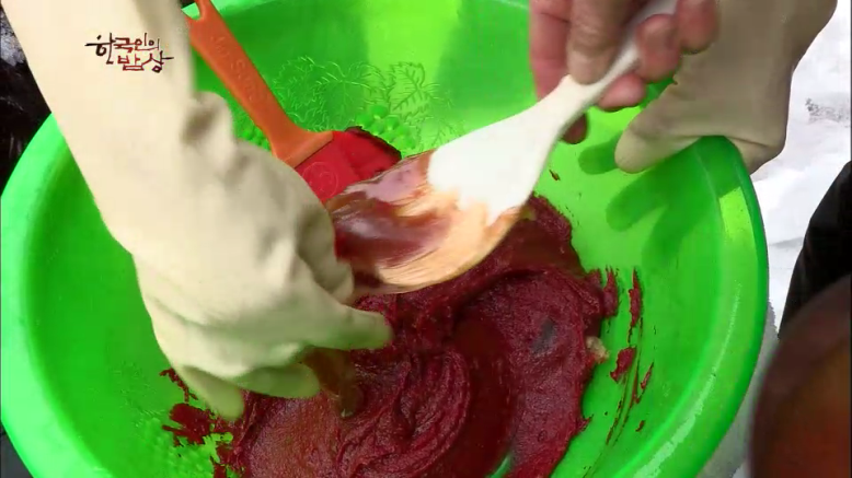 남은 고추장에 조청을 넣고 밀가루로 풀을 쑤어 고춧가루를 넣고 양을 늘립니다.