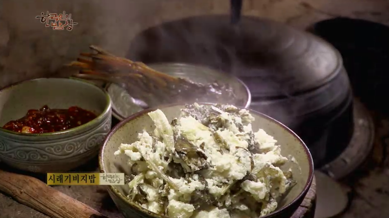 ‘시래기비지밥’은 맷돌에 불린 콩을 갈고 시래기를 삶아 솥에 기름을 두르고 잘게 썬 시래기를 넣고 불린 쌀 조금 넣고 간콩을 올려서 뚜껑을 닫고 짓습니다. 그리고 간장양념을 비벼서 먹습니다.