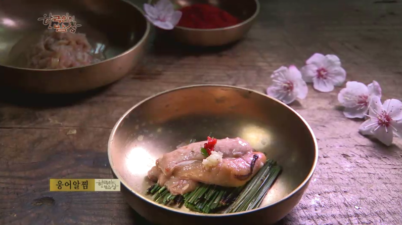 ‘웅어알찜’은 봄에 알에 기름을 발라 말려서 저장했던 것을 찜통에 솔잎을 깔고 넣은 뒤에 그 위에 새우젓을 발라 찝니다.