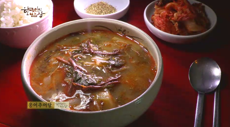‘웅어추어탕’은 물에 웅어를 넣고 푹 끓입니다. 그리고 채에 걸른 뒤에 미지근한 물을 부으면서 살을 으깨서 뼈를 걸러 내고 국물에 고사리, 숙주, 부추 등을 넣고 된장 한숟가락 넣고 푹 끓입니다. 양념장을 넣고 끓입니다.