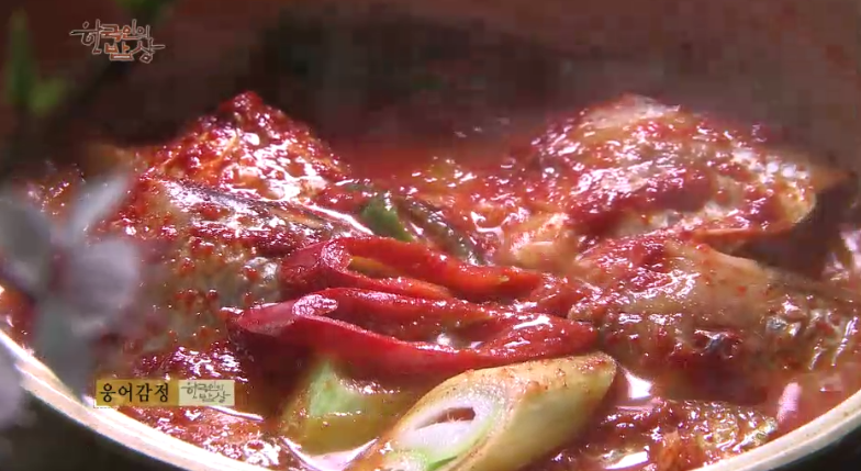 ‘웅어감정’은 냄비에 무를 깔고 그 위에 손질한 웅어를 어슷하게 썰어 올리고 고춧가루, 고추장 등 양념을 해서 자작하게 끓이고 대파, 고추를 넣고 조립니다. 그리고 쌈에 무, 웅어를 넣고 싸먹습니다.