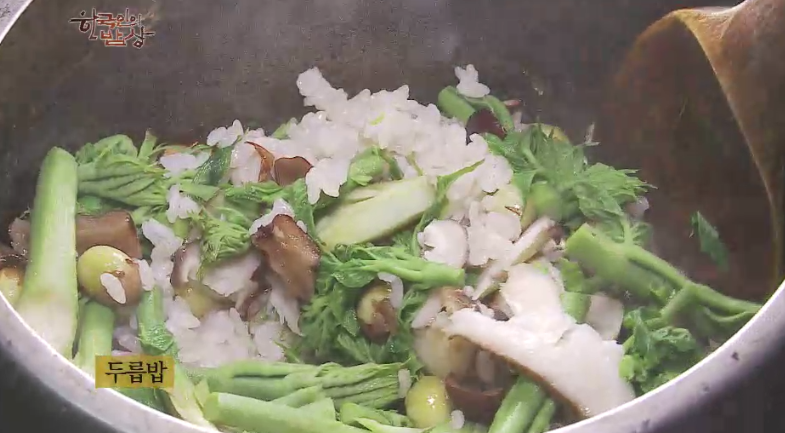 ‘두릅밥’은 참두릅을 데쳐 찬물에 씻어 먹기 좋게 자르고 쌀을 씻어 우엉, 표고버섯, 은행을 넣고 지은 뒤에 뜸을 들일 때 데친 두릅을 넣고 뜸을 들인 뒤에 달래장을 빡빡하게해서 넣고 비벼먹습니다.