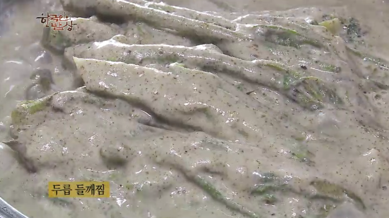 ‘두릅 들깨찜’은 대합을 기름에 볶다가 데친 두릅을 넣고 그 위에 들깨물을 붓고 끓여줍니다.