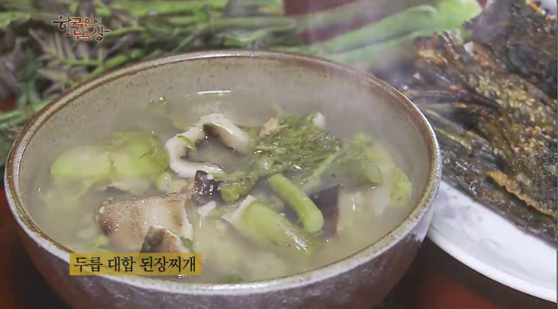 ‘두릅 대합 된장찌개’는 대합살을 발라 잘게 자르고 애호박, 버섯 등을 된장을 푼 물에 넣고 끓이다가 두릅을 넣고 끓여 줍니다.
