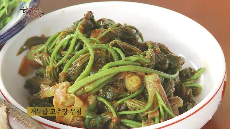 ‘개두릅 고추장무침’은 개두릅을 데쳐서 고추장에 조무조물무칩니다.