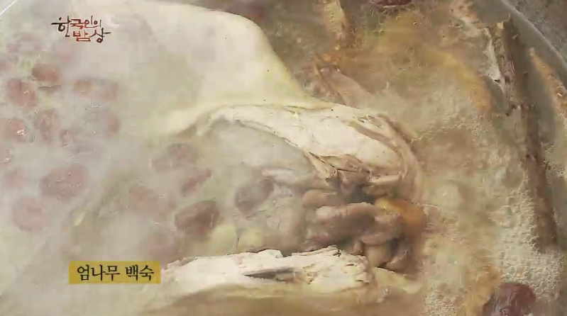 ‘엄나무백숙’은 잘 다듬은 닭을 넣고 엄나무, 대추, 밤 등을 넣고 푹 끓입니다. 그리고 그 국물에 불린 쌀을 넣고 죽을 끓입니다. 죽을 끓일 때 나물을 같이 넣고 끓이기도 합니다.