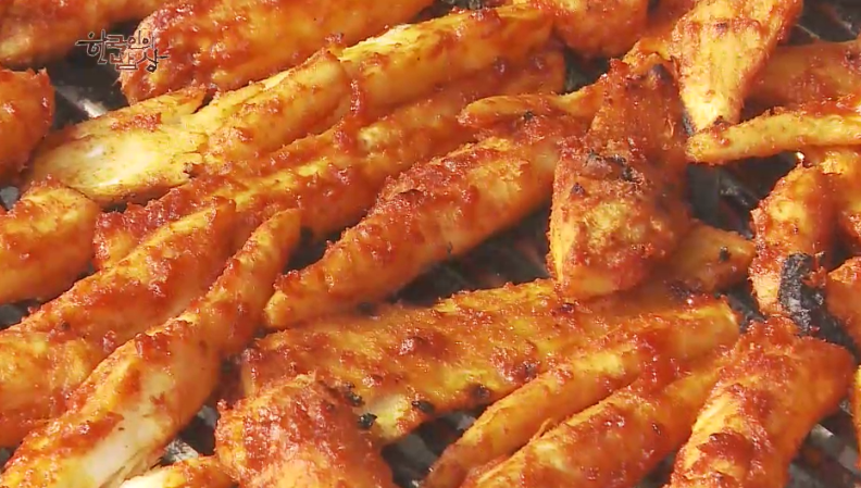 ‘더덕구이’는 더덕에 고추장양념을 바른 뒤에 숯 위에 석쇠에 올려 약한 불에 굽습니다.
