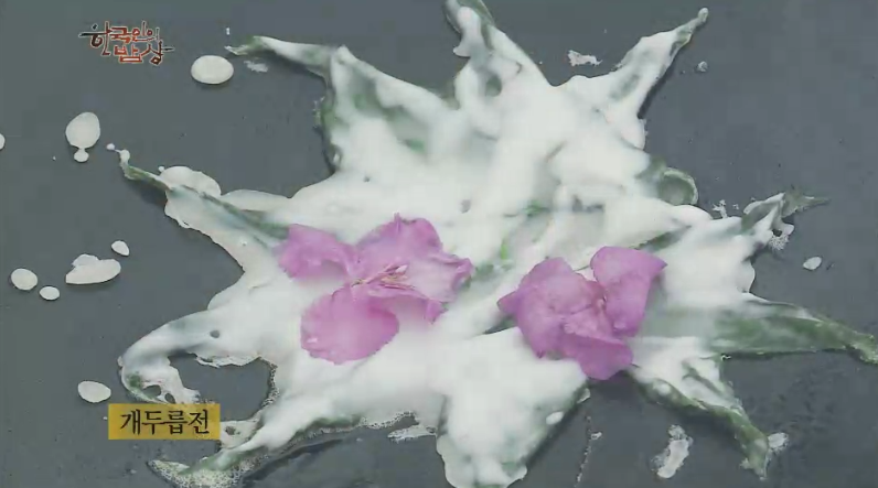 ‘개두릅전’은 두릅을 살짝 데쳐 물기를 자고 반죽 옷을 입혀서 팬에 올린 뒤에 진달래꽃을 올려 부칩니다.
