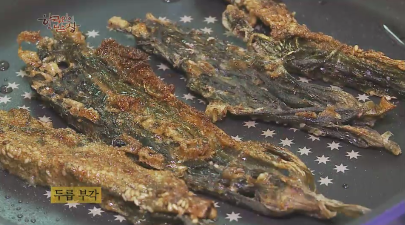 ‘두릅부각’은 끓는 물에 소금을 넣고 밑둥부터 넣고 익히다가 다 넣어 데친 다음 찬 물로 씻어 체에 받쳐 물기를 제거합니다. 그리고 풀을 쑤고 고춧가루를 넣고 섞은 뒤에 두릅에 풀을 잘 발라 그 위에 깨를 뿌려 4~6일 정도 말린 다음 먹을 때 기름을 두르고 바로 구워 먹습니다.