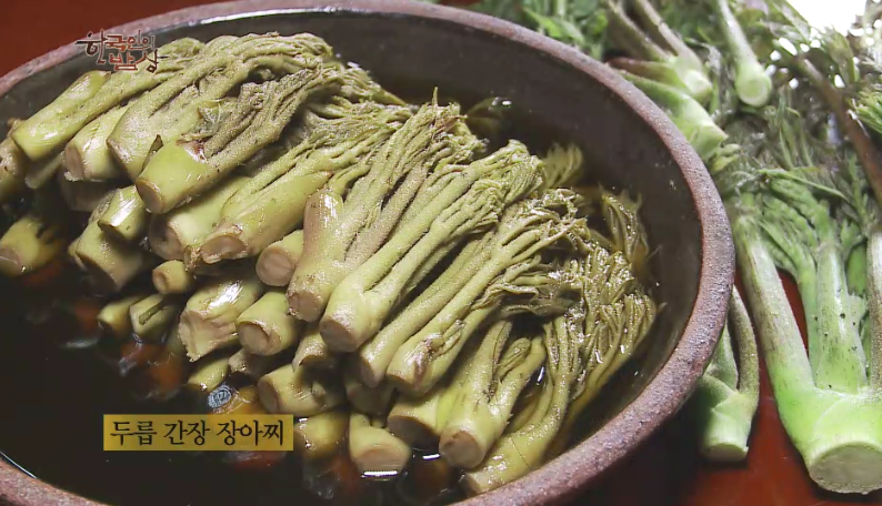 ‘두릅된장장아찌’는 항아리에 두릅을 차곡차곡 넣고 그 위에 된장을 바르고 개두릅넣고 된장바르고를 반복합니다. 꺼내서 참기름 두르고 깨소금을 올려서 먹습니다.