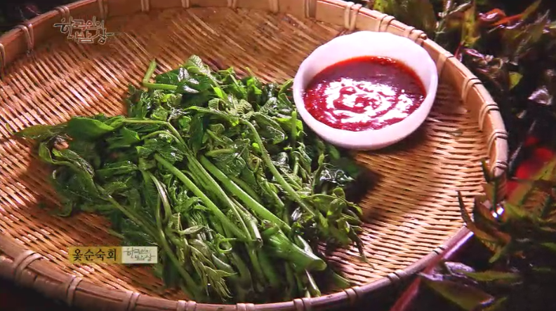 ‘옻순숙회’는 옻순을 손질해서 잘 씻은 뒤에 살짝 데쳐서 초장에 찍어 먹습니다.