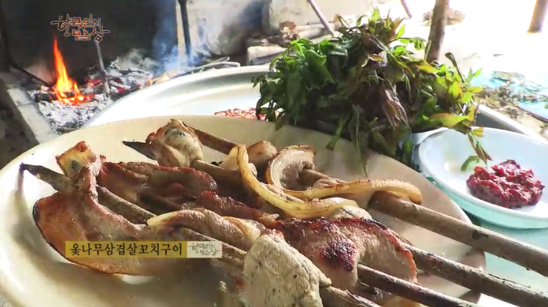 ‘옻나무삼겹살꼬치구이’는 옻 잔가지 끝을 뾰족하게 만들어 꼬치를 만들어 흑돼지 삼겹살을 꽂아서 소금을 살짝 뿌려주고 숯 위에 올려 구워먹습니다.